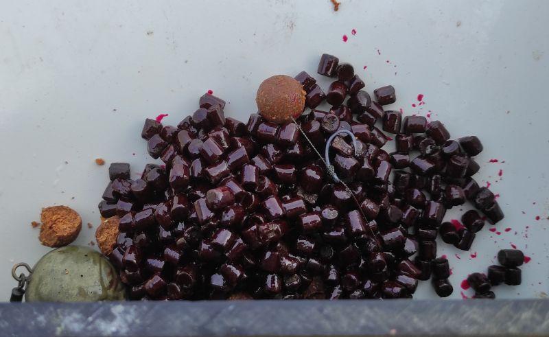 Etetési, és csalizási taktikám: minden szerkóra két marèk 4mm-es Aqua Garant Uni pellet került, egy marék tört Spice bojlival a horog mellé. Csalinak az egyik hajszálon egy szem 16mm-es süllyedő csali a fent említettből, a másikon hóember kombináció, egy felezett pop-uppal.