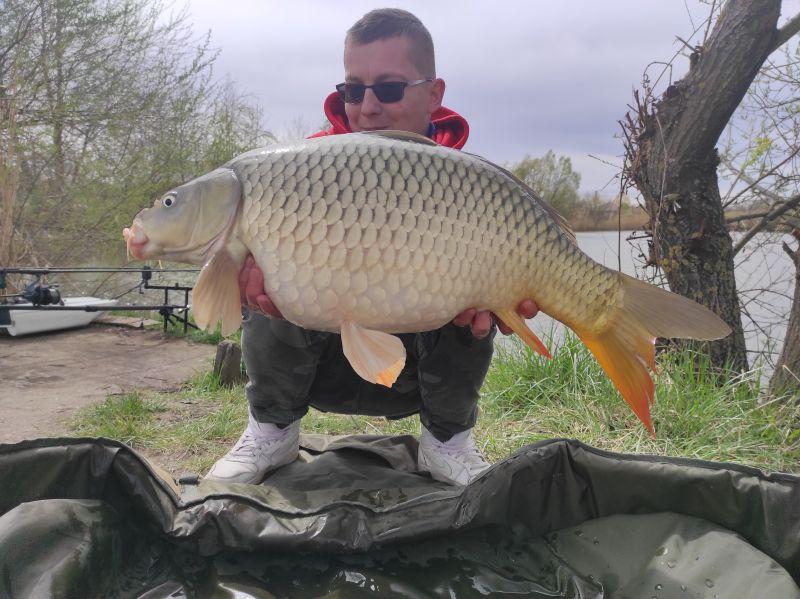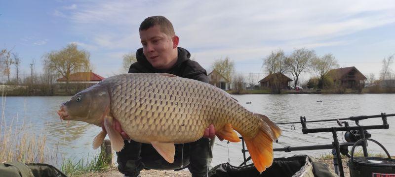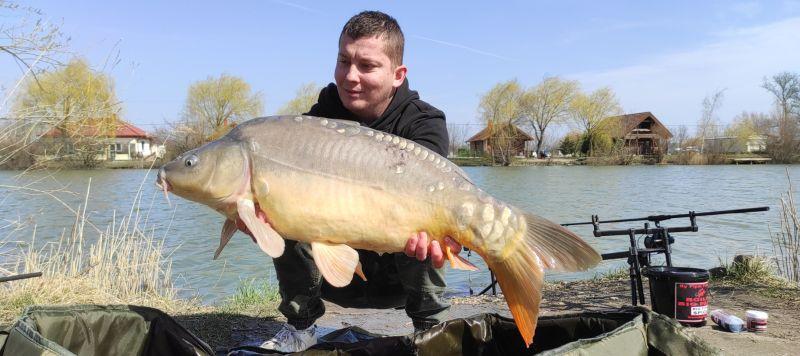 A mellettem lévő álláson megindultak a kapások, egyik halat húzták szákba a másik után. Balról, és jobbról is fogtak, szépen felpörögtek az események. Fél szemmel figyeltem az akciót, mire egyikük ezzel fordult hozzám: - A következő a tiéd! - Úgy legyen.- érkezett tőlem a válasz, majd elkezdtünk beszélgetni a sporikkal. Az eszmecserét a jelzőm hangja zavarta meg. Ràemelès után éreztem, hogy darabosabb hal van a horgomon, de tudtam, csak akkor az lesz enyém, ha már hálóba húztam. A bot hajlik, a fék sercegő hanggal engedi a zsinórt, a ponty kirohanásait pontosan követve. Élmény, ahogy a víz alatt küzd a szabadságáért, ő nem tudja, hogy egy gyors fotózás után vissza fogom engedni. Jó erőben van, ez kétségtelen, de már érezhetően fárad. Szákolás után a bölcsőben fekve csodáltam. Az év első hala mindig különleges, ez pedig egy igazán gyönyörű trófea. Horogszabadítás, és sebfertőtlenítés után úszhatott is vissza.