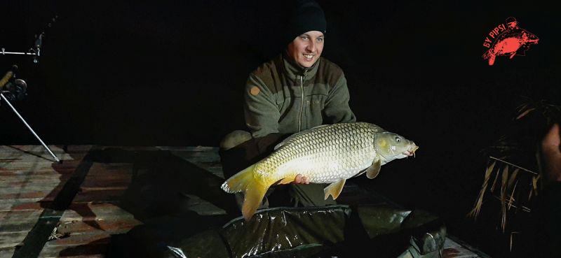 Ahogy kiértem a partra, s éppen beállítottam a swingert, a jobb botomon iszonyatos húzóerővel kapás jelentkezett a rövidebb távról. Rögtön keresni kezdtem a madarat, hogy hol akadhatott újra a zsinóromba, s pár másodperc elteltével realizáltam magamban, hogy nem erről van szó. A kontakt felvétele után, szépen lassan nyertem a métereket a part felé. Apró rúgások jelezték, hogy valószínűleg egy kisebb példánnyal állok szemben. 8-10 percig tartó fárasztás után egy egészséges 6 kiló feletti pikkelyes pontyot sikerült megszákolni. A Fish bojlit vette fel kérdés nem tűrő módon.