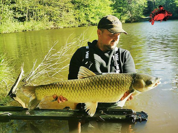 Majd eszembe jutott, Laczko barátom tippje, miszerint ő fokhagymás pellettel akasztotta meg egyik méretes amurját a tavon. Mivel a Big Fish széria nem tartalmaz ilyen aromájú csalit, ezért 16mm-es Spice bojlit kotorásztam ki a táskámból. Duplán, vastagon bepasztázva kínáltam fel, bő két marék 16 és 20-mm-es golyó társaságában, és a nádas végénél, a bokorsor elején helyeztem ki. Fél óra múlva egy csippanás. Aztán mégegy. Láttam, ahogy bólogat a spicc, mint a feederboton, amikor egy kis keszeg próbálkozik felemelni a kosarat a fenékről. Fék behúz, bot felemel, látom a zsinóron, hogy már jócskán eltávolodott az akasztás helyétől, sebesen közeledett a túloldali vízbe dőlt fához. Előbb kellett volna felvennem a kontaktot a hallal, mert így sajnos az akadók közé úszott. Berni segítségét hívtam, gyorsan a mellescsizmába pattantam, és a partvonalat követve araszoltam kiszabadítani ellenfelem az ágak fogságából. Szerencsére csak a szélét érte el, így két vékonyabb gally letörése után újra akadálymentesen fáraszthattam. Könnyedén vontattam vissza a stég irányába, gondoltam egy kisebb potyka, és micsoda katymaszt okozott. Ám amikor először felhúztam a felszínre láttam csak meg, hogy egy szép amur van a horgomon. Azonnal lazítottam a féken, mert tudtam, hogy ez a meccs még nincsen lefújva. Így is volt, 25-30 percig kűzdöttünk magam előtt pár méterrel, akárhányszor elérte a felszínt, újra visszatört a mélybe. Végül teljesen kimerült, és biztonságosan, száktörés nélkül meg tudtam meríteni. A fűponty súlya súrolta a 12 kilót.