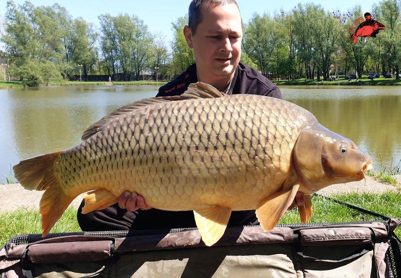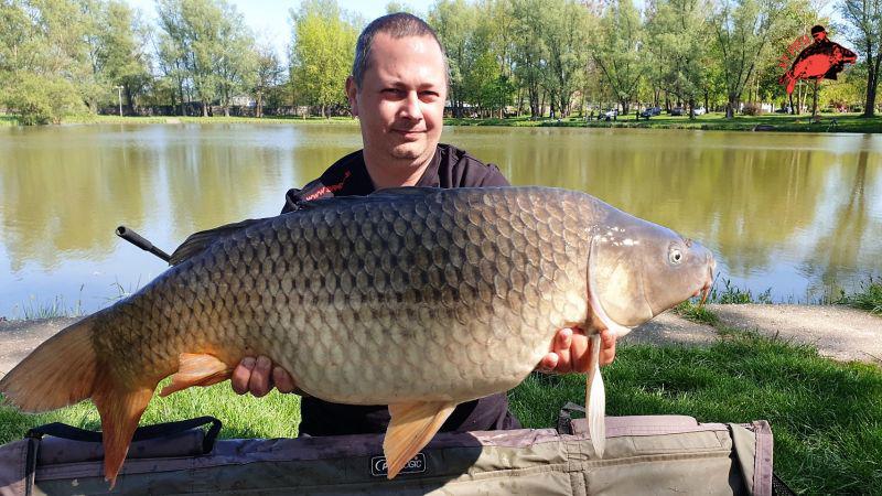Kipakolás után a parttól 60-70 méterre kezdtem meg az etetést, ismét 1-1 kiló bojli került a vízbe vegyesen. Mivel vészesen fogyóban volt a Krillem, arra gondoltam hogy csalit váltok. Az első előkémre 20mm-es Spice került, a másik bottal pedig a paletta többi tagja váltogatva. Gyors peca lévén háromnegyed óránként frissítettem. A tavat mondanom se kell, hogy teljesen körbeülték a horgászok. A délelőtt kapástalanul telt. Közben az időjárás is nyáriassá változott. Délidőben a tó túlsó felén, a sekély vízben fogtak pár szép, nagytestű pontyot. Nem adtam fel, hisz tudtam, hogy az én állásom is a „halasabbak” közé tartozik. 2 óra körül a szomszédommal beszélgetve füstölős kapásra lettem figyelmes. Megakasztottam, és éreztem, hogy egy szebb példány lesz. Pár perces fárasztást követve partra is került az első halam, ami 14.6 kg-os volt. A csípős-fűszeres hóember tetszett meg neki.