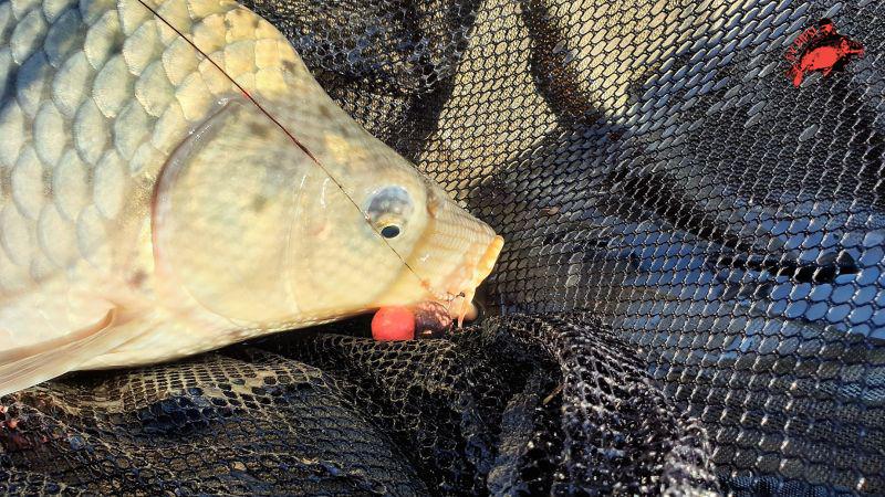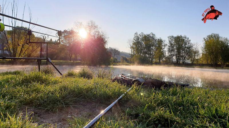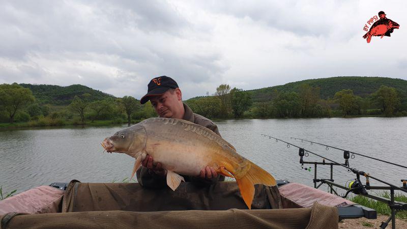 Két óra elteltével frissítettem a csalikat. Borongós, szeles idő érkezett, ekkorra tört be a hidegfront, kissé le is hűlt az levegő. Várakozás közben meglátogattuk a szomszéd álláson lévő horgászokat, informálódni az eredményeikről. Ezt követően nem sokkal meg is érkezett az első halam, az oldódó zacskós cuccra. Nem szoktam kapkodni ha kapásom van, így szépen visszasétáltam a horgászállásunkra, és megakasztottam a halat. Mivel kavicsbánya, a meder sok töréssel tarkított, és a halak is virgoncabbak az átlagnál. Az első fogás súlya 9.5 Kg volt.